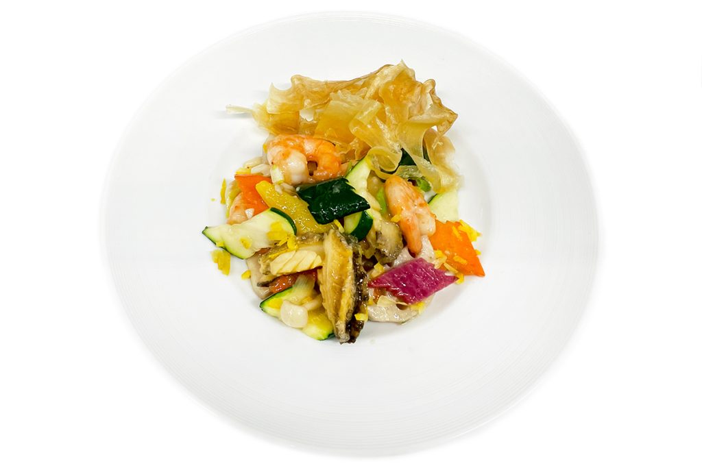 贅沢に鮑を使用した、柚子の香りが際立つ炒め料理です。豪華な食材と柚子の爽やかな風味は満足いただけること間違いなし。