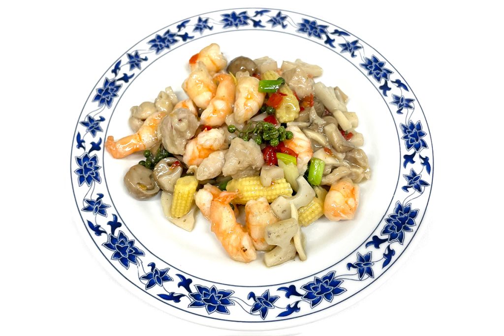 B.鶏肉とエビの青山椒炒め