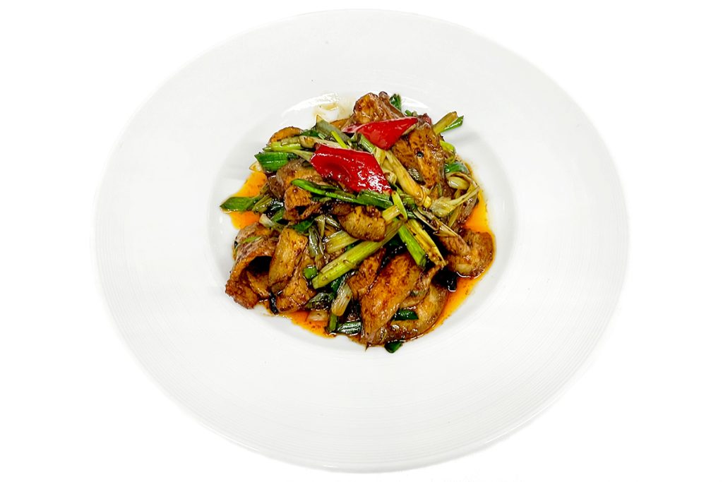 〈料理長からのメッセージ〉独特な食感のセンマイと発酵唐辛子を使い、強火で炒め上げました。葱と生姜、中国料理ならではの香りをお楽しみください。