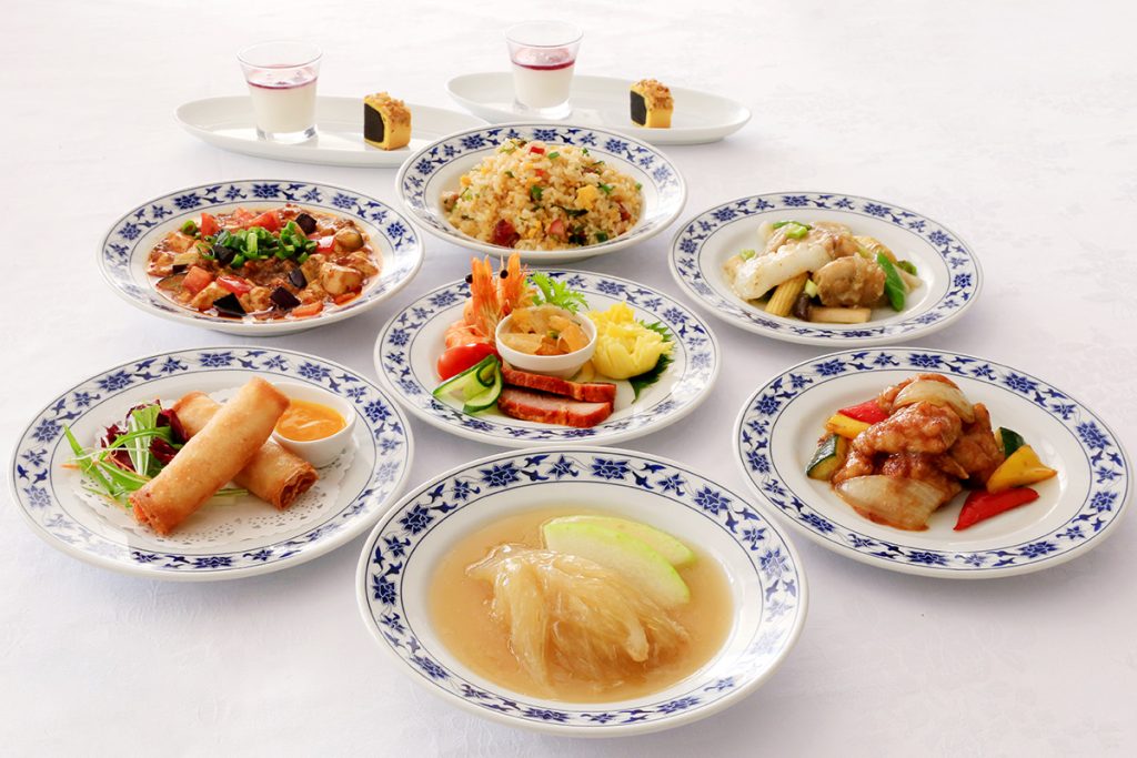 クラゲの冷菜/野菜の甘酢漬け/牛肉の煮こごり/本日の焼物/春巻き/大海老のマヨネーズ/大海老のチリソース/叉焼と卵の炒め/麻婆豆腐