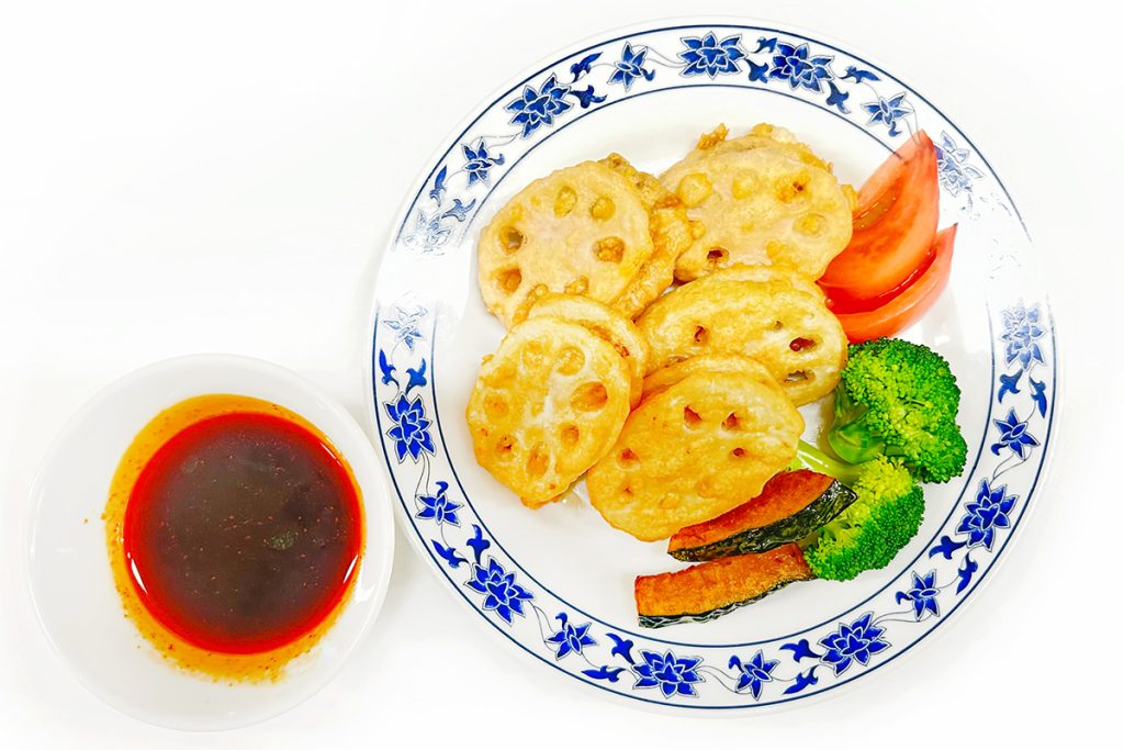 B.蓮根とエビのすり身のはさみ揚げ 麻辣ソース