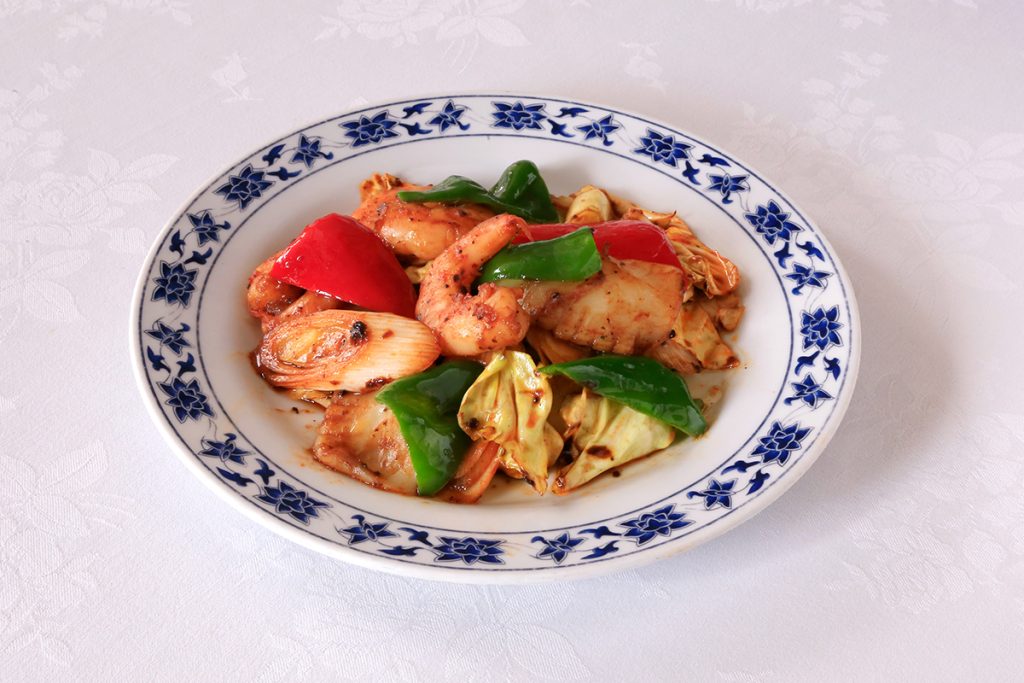 プリっとした海鮮に春キャベツを合わせた炒め物。豆鼓の塩気と発酵のコクで香ばしく仕上げた重慶飯店特製の一品。