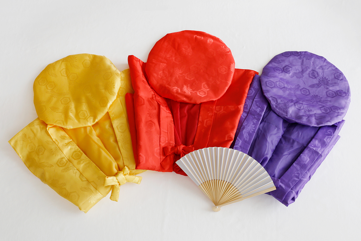 お祝いに合わせた赤・紫・黄の3色をフリーサイズでご用意しております。ご利用の際はスタッフまでお申し付けください。