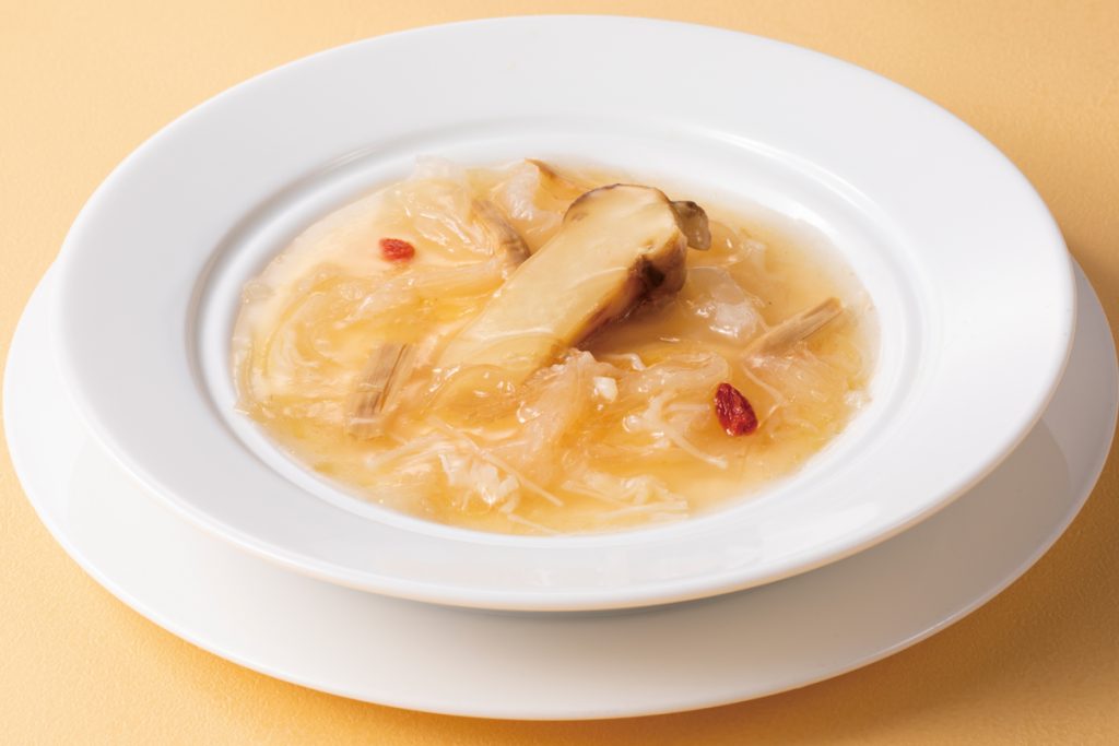 松茸の香りと干し金針菜、白木耳、覇王花など数種類の薬膳野菜由来の滋味を澄んだ味わいの餡で閉じ込めた、とろり食感の茶碗蒸しです。