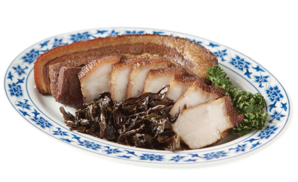 ボイルした皮付き豚を高温の油で揚げ、旨味を中に閉じ込めてから八角や山椒、シナモンなどの香辛料の汁とウーロン茶を合わせじっくり柔らかく煮込みました。