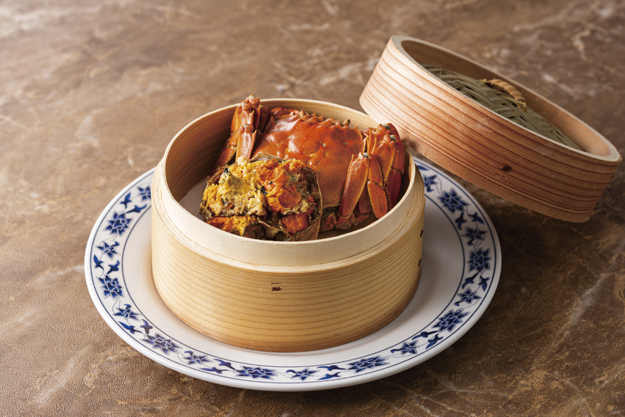 上海蟹の醍醐味である「姿蒸し」は、鮮やかな朱色の殻と肉厚な身が特徴です。いち早く入荷するメスは濃厚な蟹味噌を、11月に旬を迎えるオスは白子を含む深い味わいをご堪能いただけます。
